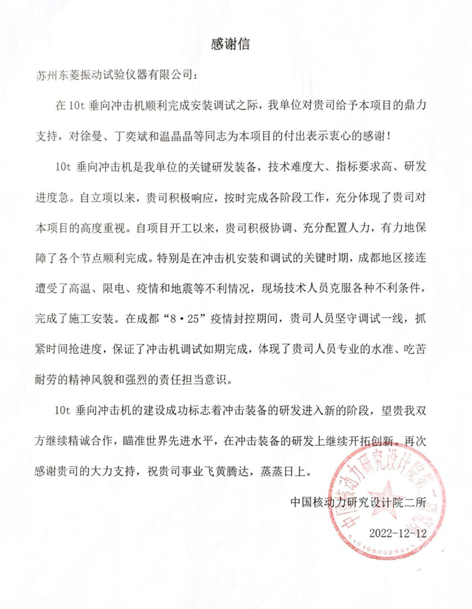 近日,我会副会长单位东菱公司收到中国核动力研究设计院发来的感谢信。信中,核动力院对10吨垂向冲击机项目组在设计研发、安装调试全过程中展现出的专业的技术实力、强烈的担当意识和吃苦耐劳的精神风貌给予了高度赞扬和感谢,并表示愿与东菱公司在今后的装备研发中继续精诚合作,共铸辉煌。