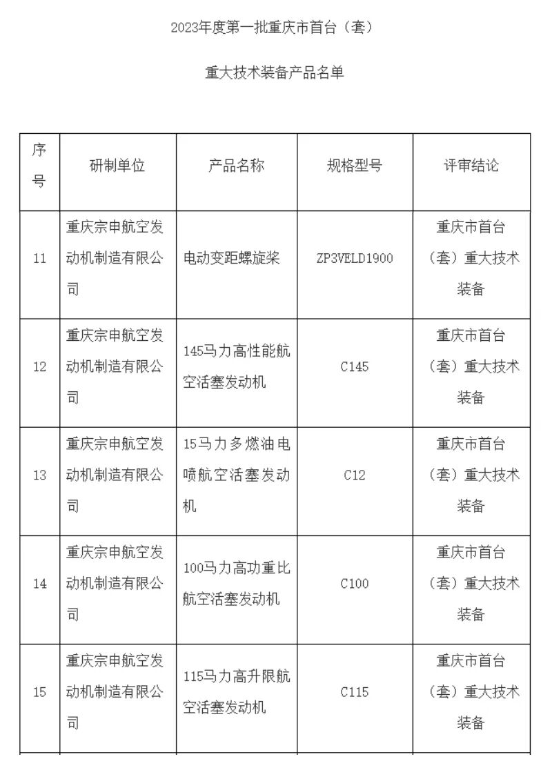宗申航发5款产品入选“2023年度第一批重庆市首台(套)重大技术装备产品”名单