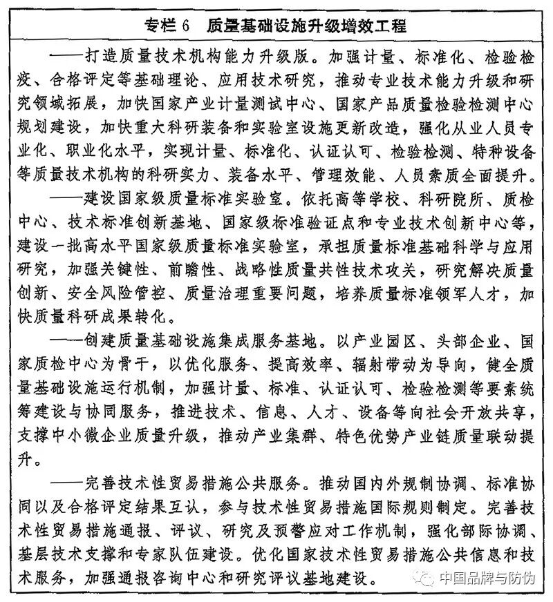 (二十三)加强质量基础设施能力建设。合理布局国家、区域、产业质量技术服务机构,建设系统完备、结构优化、高效实用的质量基础设施。实施质量基础设施能力提升行动,突破量子化计量及扁平化量值传递关键技术,构建标准数字化平台,发展新型标准化服务工具和模式,加强检验检测技术与装备研发,加快认证认可技术研究由单一要素向系统性、集成化方向发展。加快建设国家级质量标准实验室,开展先进质量标准、检验检测方法、高端计量仪器、检验检测设备设施的研制验证。完善检验检测认证行业品牌培育、发展、保护机制,推动形成检验检测认证知名品牌。加大质量基础设施能力建设,逐步增加计量检定校准、标准研制与实施、检验检测认证等无形资产投资,鼓励社会各方共同参与质量基础设施建设。