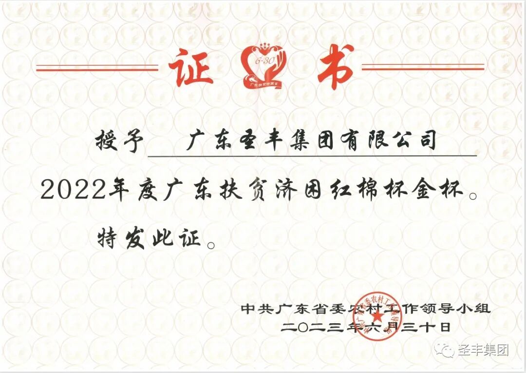 圣丰集团再度荣获广东扶贫济困红棉杯金杯